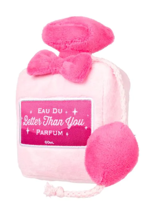 Better Than You Parfum ist inspiriert von Schminktischen der frühen 2000er, Lipgloss-Obsessionen und Trennungen von besten Freunden per SMS. Es hat die Form eines Vintage-Parfümflakons, ist mit ungenierter Selbstsicherheit verarbeitet, weich, quietscht und einfach so in knalligem Pink abgesetzt. Dieses Spielzeug ist für Hunde gemacht, die selbst im Schlafanzug noch teuer aussehen wollen.